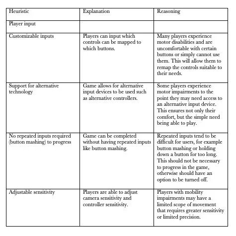 To gain a better sense accessibility of within mainstream games, I conducted a heuristic evaluation using a set of heuristics I have created for this purpose. The heuristics were based on: player input and gameplay options.